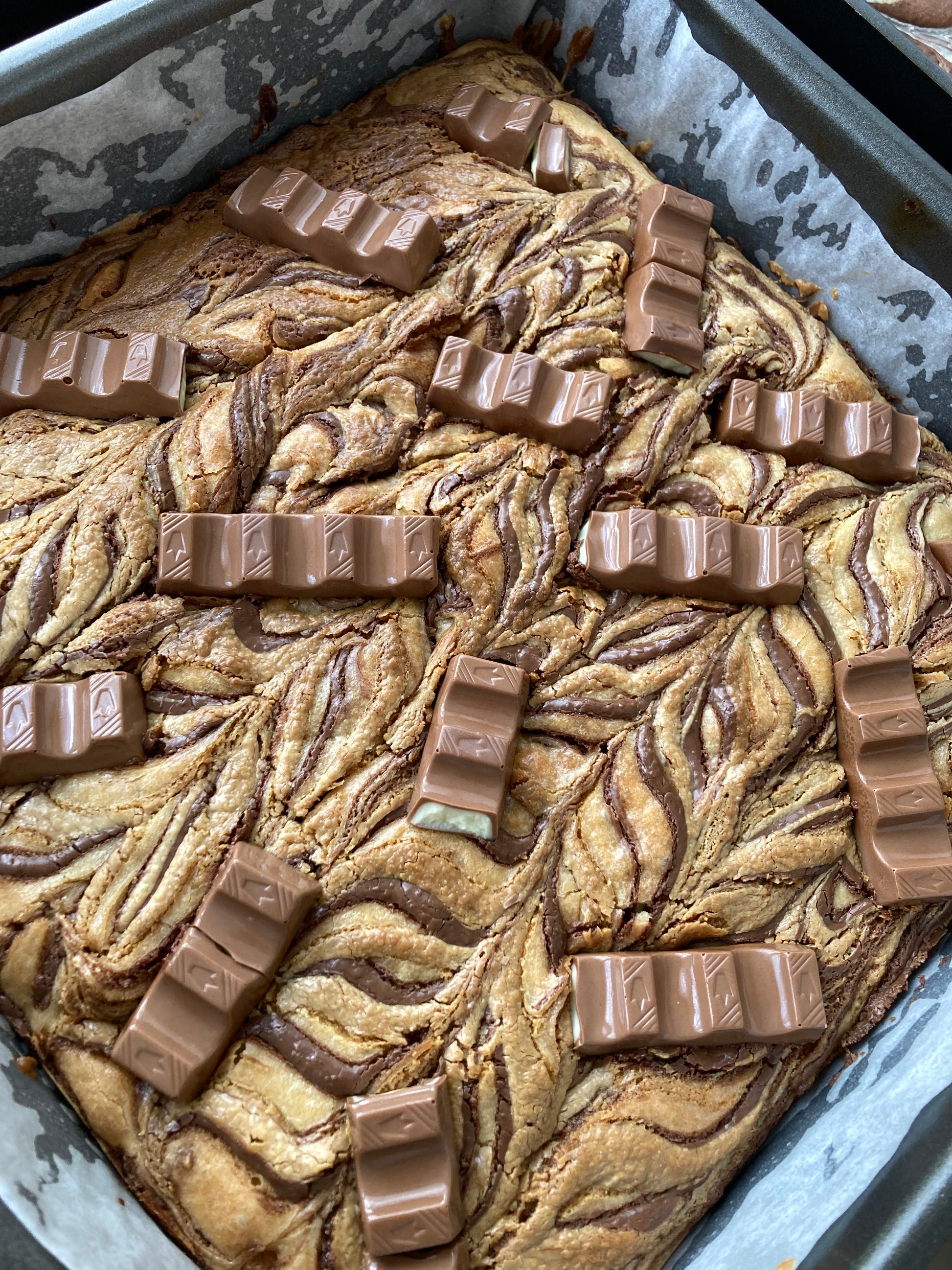 So when you take our signature blondie base and add in thick swirls of Kinder spread and Nutella you're left with a fudgey, chocolatey, nutty taste sensation that you'll want to enjoy more and more of.