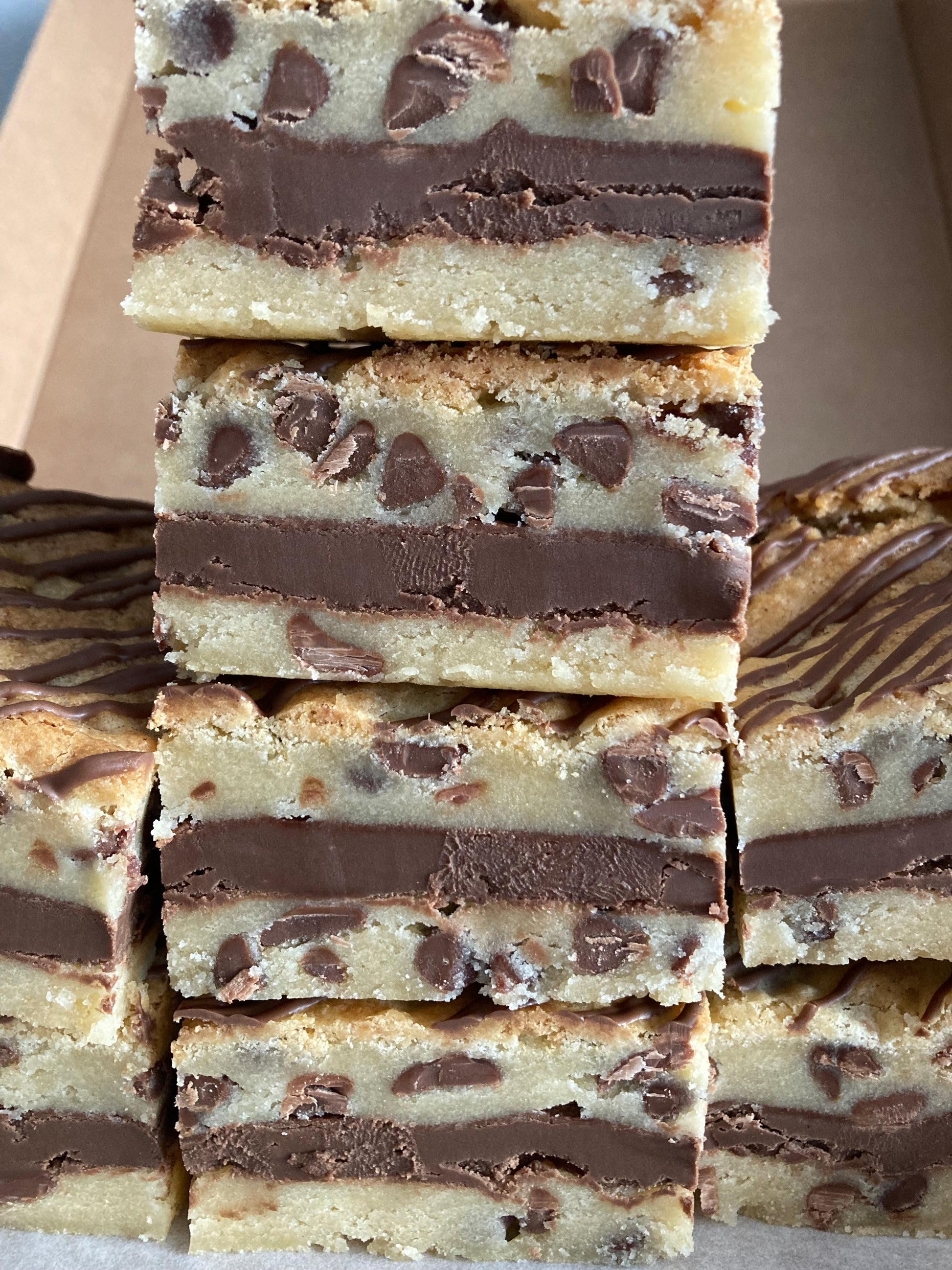 To make our cookie slices we infuse cookie dough with chocolate chips and pack it all into a baking tray so that we can serve you with little slices of heaven.